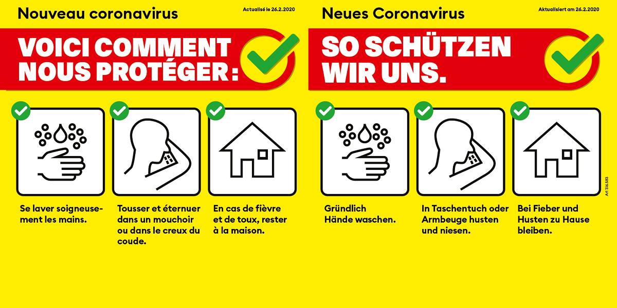 Das zuständige Gesundheitsamt empfiehlt Organisatoren von Veranstaltungen mit weniger als 1000 Besuchern, diese mittels aufgehängten Plakaten des Bundesamtes für Gesundheit sowie entsprechenden Durchsagen auf die wichtigsten Hygiene- und Schutzmassnahmen aufmerksam zu machen. Hotline NW: 041 618 76 02 - OW -> BAG