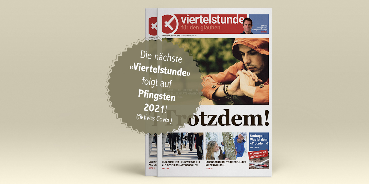 Dieses Jahr ist von Abstand, Reduzierung der Kontakte und Unsicherheit geprägt. Trotzdem will die Schweizerische Evangelische Allianz SEA mit der «Viertelstunde für den Glauben» weiterhin Menschen erreichen, um ihnen den Glauben näher zu bringen. Mit der Verteilzeitung, die seit 17 Jahren für dieses Anliegen steht, können wir auch nächstes Jahr wieder Hoffnung und Mut zu den Menschen bringen. Die Pfingstausgabe 2021 kann jetzt vorbestellt werden.