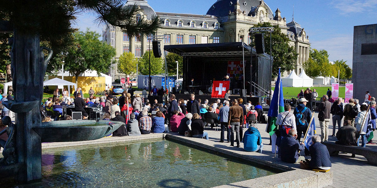 Am Samstag versammelten sich gegen 300 Beterinnen und Beter während zwei Stunden auf der grossen Schanze in Bern. Der erste Teil gehörte dem Dank. „Als Schweizer verbindet uns eine grosse Dankbarkeit mit dem Land“, hiess es in der Liturgie. Gedankt wurde etwa für den Reichtum an Ernte, den Rechtsstaat und die Meinungsfreiheit. In den Bitten und Fürbitten wurde Gott um Orientierung in allen Gesellschaftsbereichen, um Stärkung der Familien, um Segen für Verantwortungsträger, für unsere Landwirtschaft und die KMU gebeten. Auch die Busse wurde nicht vergessen: „Wir tun Busse, weil unser monetäres Denken dazu führt, dass ein Ruhetag immer mehr aus der Arbeitswelt verdrängt wird. Wir tun Busse, weil wir unseren Reichtum nicht mit dem Schwachen teilen. In allen Bereichen der Gesellschaft erfahren wir einen Wertezerfall. Der Bezug zu Jesus Christus, welcher unser Land stark geprägt hat, weicht zunehmend der Neutralität.“