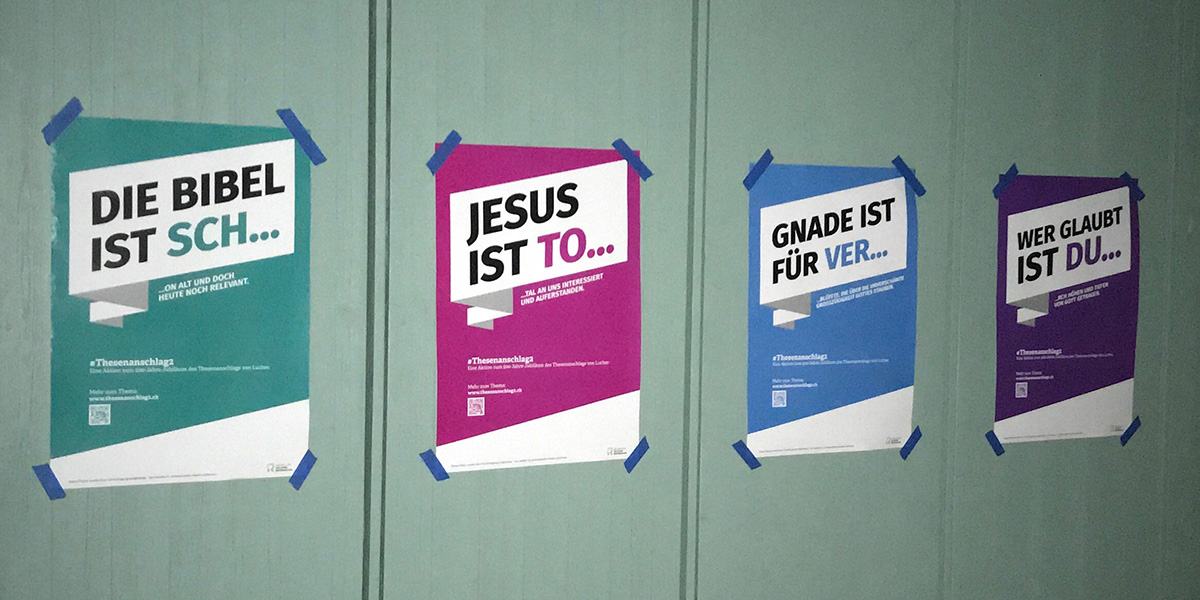 Heute am frühen Morgen, genau 500 Jahre nach dem Thesenanschlag von Luther, hängten Christinnen und Christen an ca. 140 Orten insgesamt gegen 10’000 Plakate an öffentlichen Orten auf. Inhalt sind auf den ersten Blick bewusst provokante Thesen. Initiert von der Schweizerischen Evangelischen Allianz SEA, soll die Aktion an die Grundsätze der Reformation von Luther erinnern und die Menschen zum Nachdenken über den Glauben und Gott anregen. Eine coole Aktion, wie wir finden, aus der sich hoffentlich auch spanndende Gespräche ergeben. Unten finden Sie den facebook-Link mit vielen Impressionen aus verschiedenen Orten…