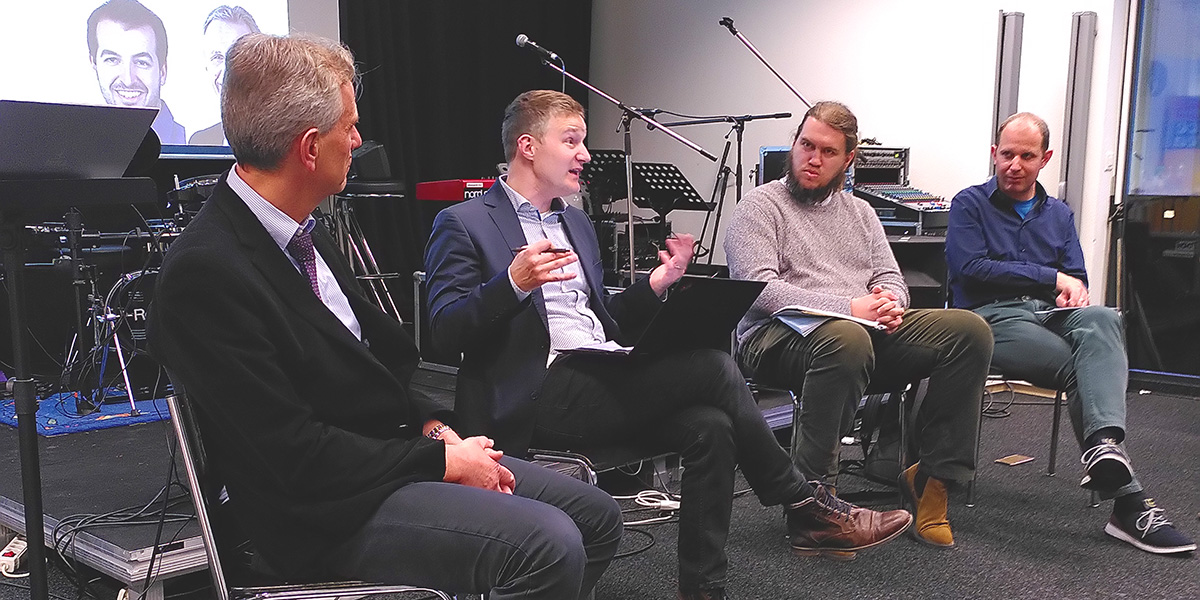 Hauptreferent René Hefti, SEA-Co-Generalsekretär Andi Bachmann-Roth, Josua Schöchli und Matthias Egg (beide DenkBar, v.l.) vertieften die Erkenntnisse im Dialog mit dem Publikum.