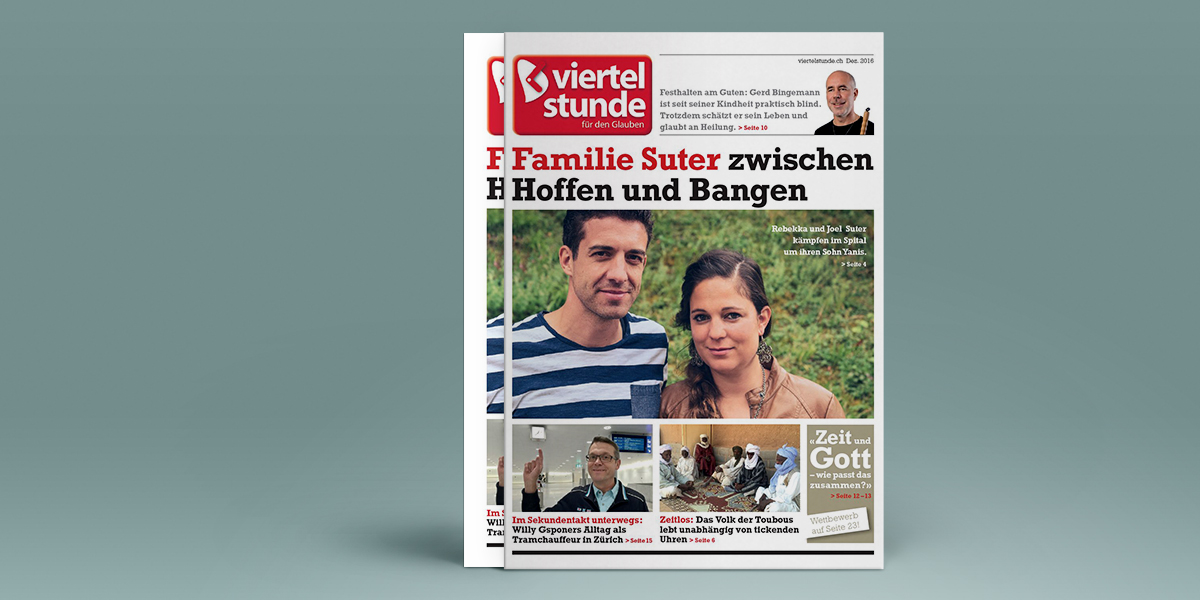 Ende November erscheint die nächste Ausgabe der „Viertelstunde für den Glauben“. Wie schon in den vergangenen Jahren dürfen wir sie dank Dorfpatinnen und Dorfpaten in diversen Städten und Dörfern der Schweiz verteilen. Und auch dieses Jahr wird sie dem Blick beigelegt werden. Die Verteilung und die Beilage werden am 22. Dezember sein. In dieser Weihnachtsausgabe geht es um das Thema Zeit: Nebst anderen spannenden Berichten und Portraits erzählen beispielsweise ein Uhrmacher und ein Tramchauffeur aus ihrem Alltag, ein Astrophysiker definiert Zeit und ein Reisebericht aus dem Tschad zeigt ein Volk, bei dem die Uhrzeit keine Bedeutung hat. Die Titelgeschichte erzählt von einer Familie, die 13 Tage um ihr schwerkrankes Neugeborenes kämpften und wie sie Gott in dieser schwierigen Zeit erlebten.