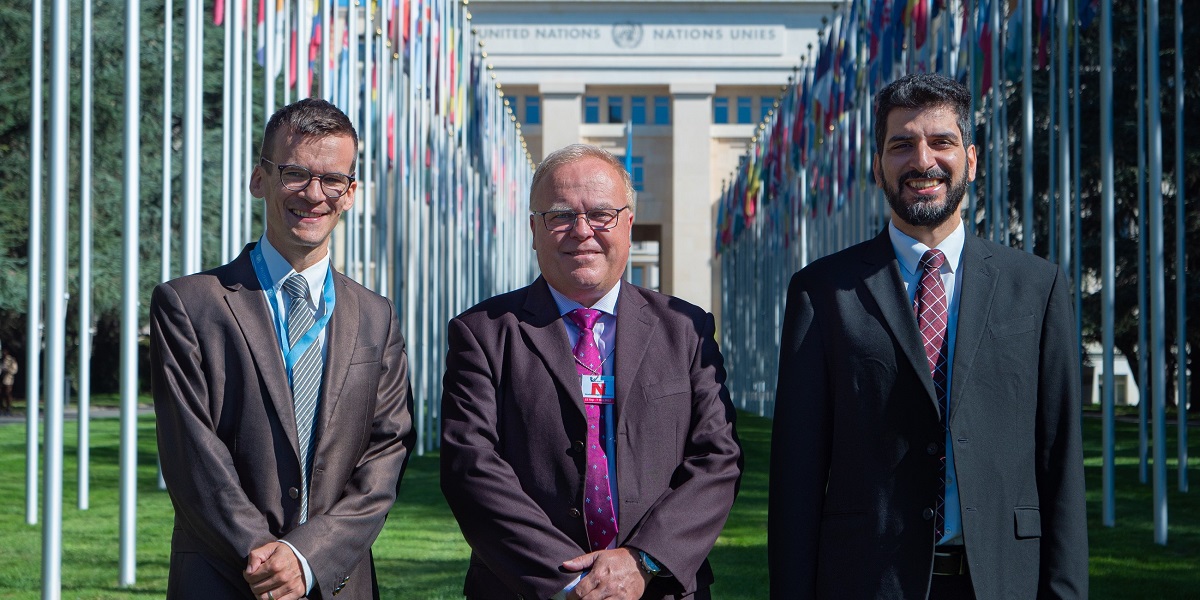 v.l.: Michael Mutzner übergibt die Leitung in Genf an Gaetan Roy (ständiger Vertreter) und Wissam al-Saliby (Direktor).